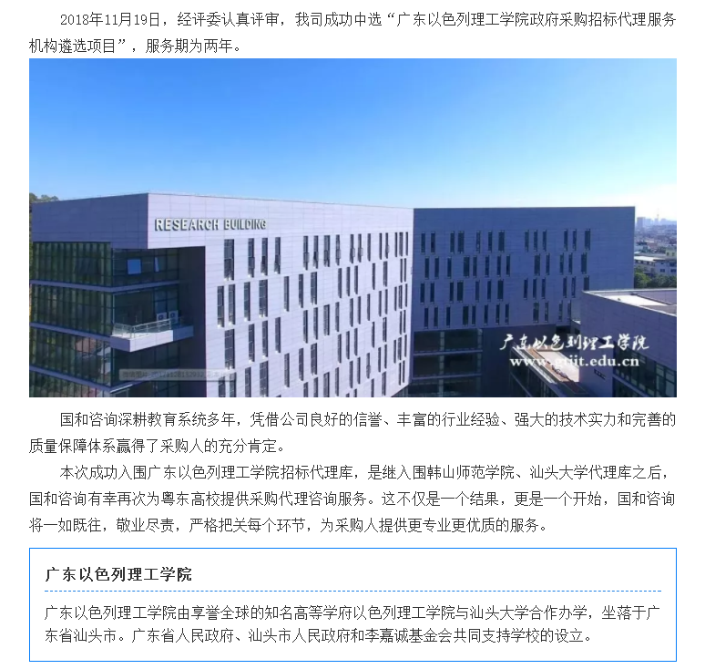 我司成功中選“廣東以色列理工學(xué)院政府采購招標代理服務(wù)機構(gòu)遴選項目”