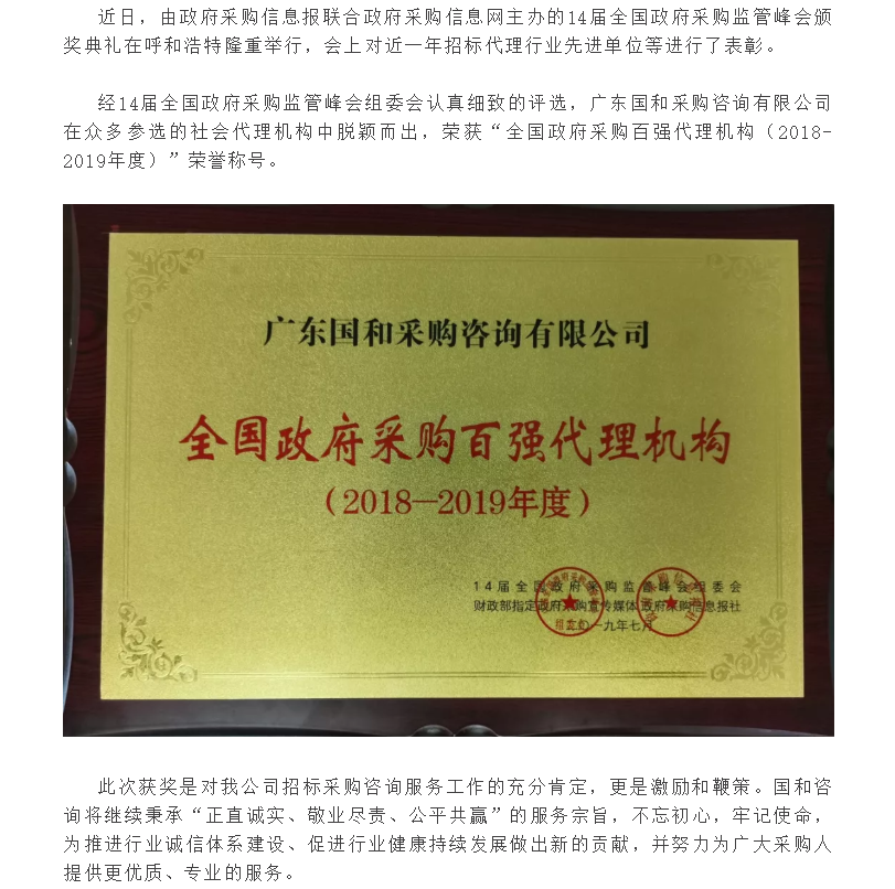 祝賀我公司榮獲“全國(guó)政府采購(gòu)百?gòu)?qiáng)代理機(jī)構(gòu)(2018-2019年度)”榮譽(yù)稱號(hào)