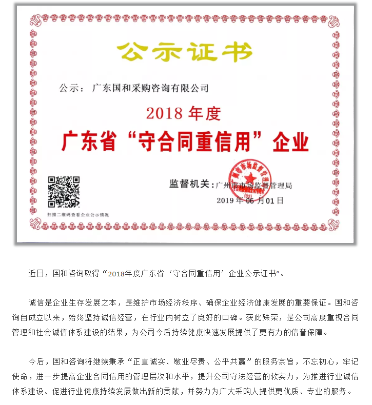 國(guó)和咨詢?nèi)〉谩?018年度廣東省‘守合同重信用’企業(yè)公示證書”