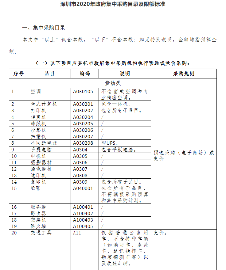 根據(jù)《深圳經(jīng)濟(jì)特區(qū)政府采購條例》、財(cái)政部《地方預(yù)算單位政府集中采購目錄及標(biāo)準(zhǔn)指引(2020年版)》以及省財(cái)政廳有關(guān)通知文件的規(guī)定,我局制定了《深圳市2020年政府集中采購目錄及限額標(biāo)準(zhǔn)》,已經(jīng)市政府批準(zhǔn),現(xiàn)印發(fā)給你們,自公布之日起執(zhí)行。